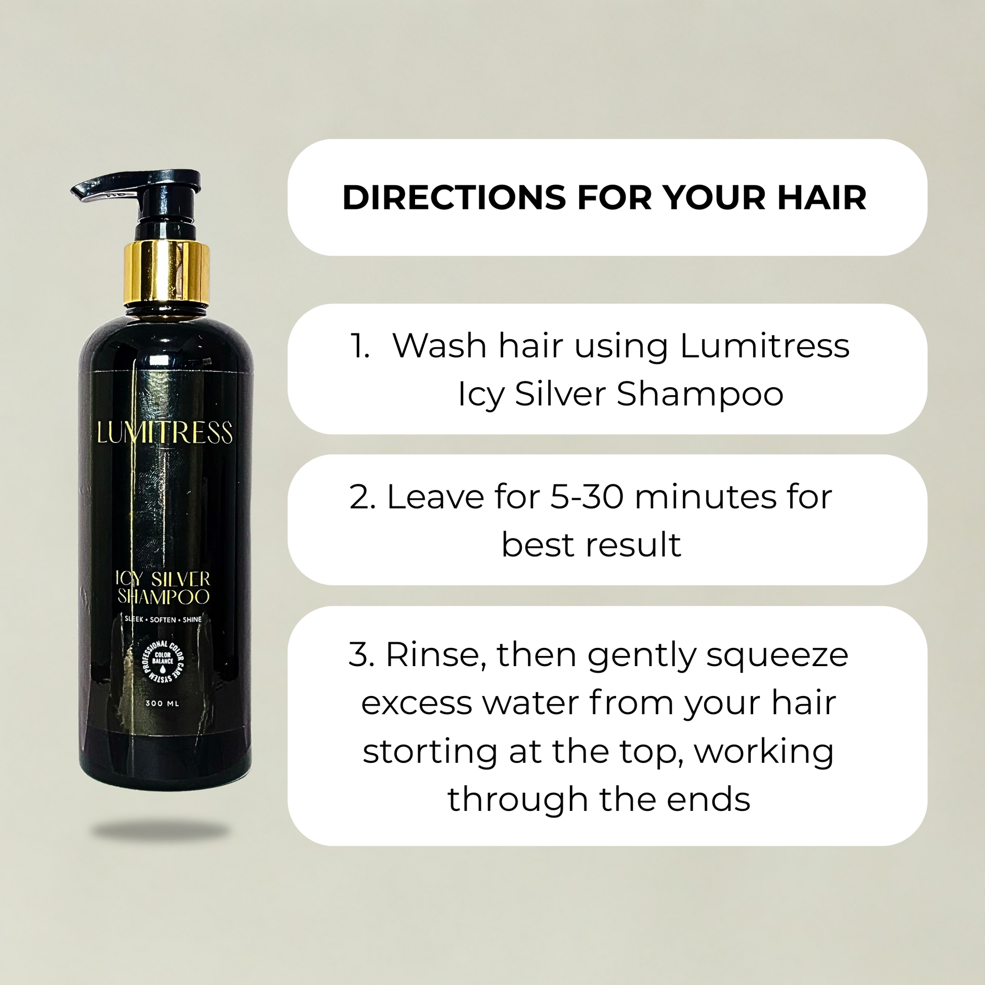 - Wash hair using Lumitress Icy Silver Shampoo.
