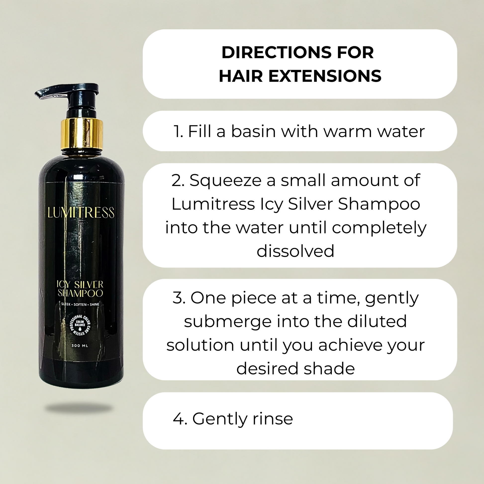 - Squeeze a small amount of Lumitress Icy Silver Shampoo into the water until completely dissolved.