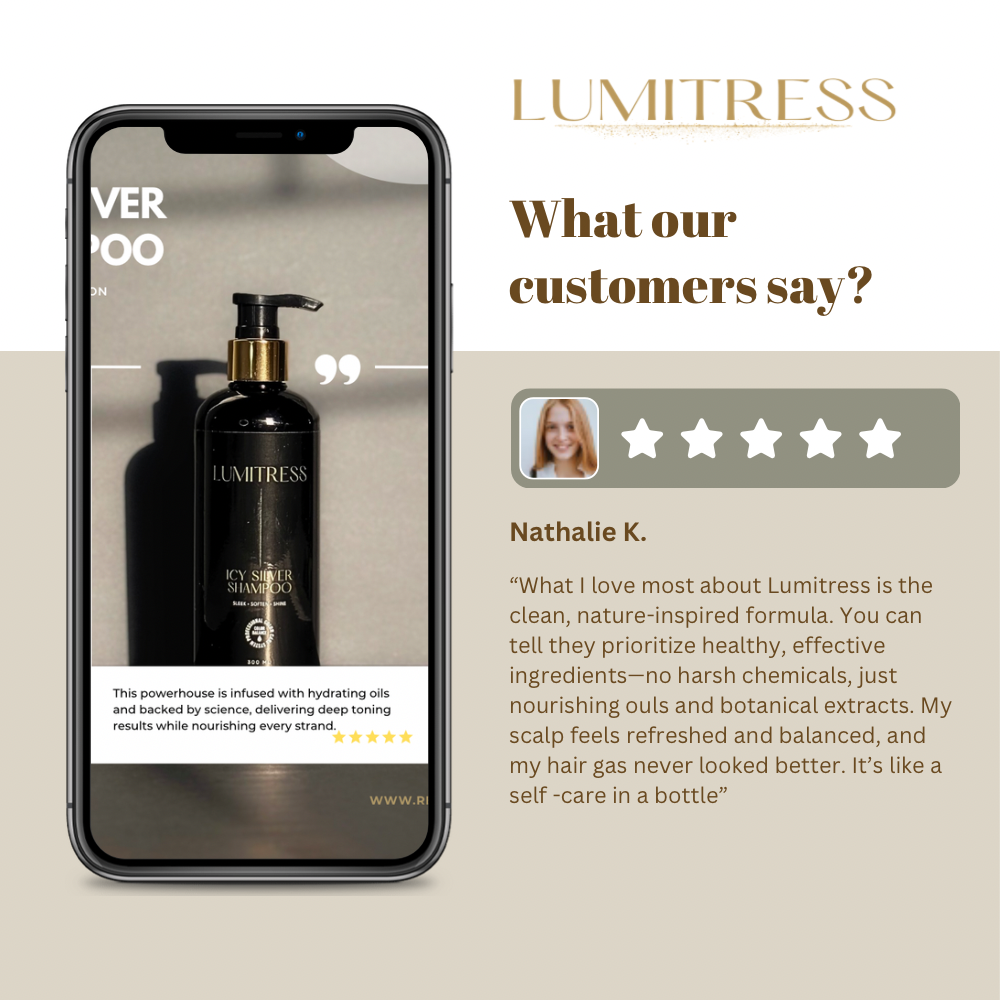 LUMITRESS™ Icy Silver Toning Shampoo is a salon-grade formula designed to tone even the brassiest blondes and brunettes into cool, ashy perfection—all without the dryness. Unlike traditional purple shampoos that strip moisture, this powerhouse is infused with hydrating oils and backed by science, delivering deep toning results while nourishing every strand.